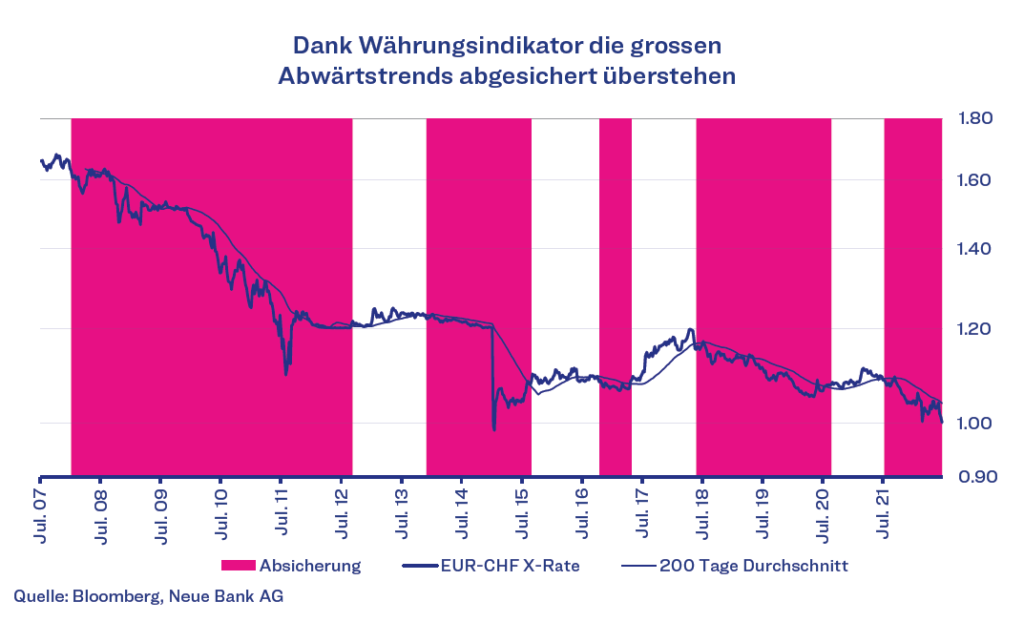 Für einen Euro (EUR) bekommt man mittlerweile weniger als einen Schweizer Franken (CHF). So tief war der Wechselkurs zuletzt im Januar 2015, als die Schweizerische Nationalbank (SNB) die damals festgelegte Untergrenze von 1.20 aufgehoben hatte. Dank der konjunkturellen Erholung stieg der EUR in der Folge auch ohne Stützung der SNB bis 2018 wieder auf 1.20. Danach begann aber ein bis heute andauernder Abwärtstrend, welcher nur kurz – aufgrund der konjunkturstützenden Massnahmen während der Corona-Krise – unterbrochen wurde. Dank unserem Währungsindikator hatten wir während der Abwärtstrends jeweils die EUR in den gemischten CHF-Portfolios abgesichert.