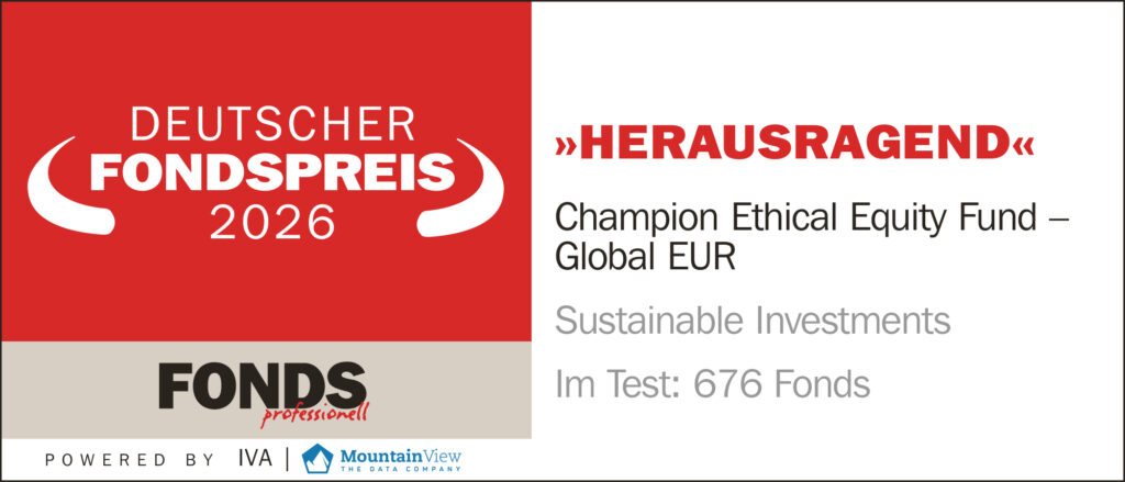 Auch im Jahr 2026 konnte der Champion Ethical Equity Fund – Global EUR seine ausgezeichnete Wertentwicklung erneut unter Beweis stellen. In einem anspruchsvollen Auswahl- und Bewertungsverfahren wurde der Fonds unter insgesamt 676 analysierten Fonds mit dem Prädikat „Herausragend“ ausgezeichnet. Diese erneute Auszeichnung bestätigt die konstant starke Performance über einen längeren Zeitraum sowie die hohe Qualität der aktiven Managemententscheidungen. Der Fonds zeigt eindrucksvoll, dass eine konsequent umgesetzte nachhaltige Anlagestrategie langfristig attraktive Renditen erzielen kann und sich auch im internationalen Wettbewerbsumfeld erfolgreich behauptet.