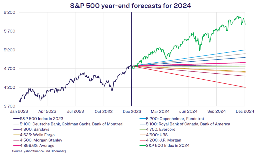 To illustrate the accuracy of the forecasts, we added the actual performance of the S&P 500 for 2024 (green line) to the chart. It is evident that all the strategists from the financial institutions significantly