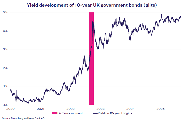 Investor confidence in a country can be gauged by the performance of its government bonds. If confidence in the likelihood of repayment declines, government bond prices fall and yields rise because buyers want higher risk premiums. The Liz Truss moment shows how quickly this can happen. In September 2022, then British Prime Minister Liz Truss and her Chancellor of the Exchequer Kwasi Kwarteng presented a debt-based tax cut programme to stimulate economic growth. Bond investors now expected a significantly lower probability of repayment, despite the UK’s good credit rating. As a result, UK government bond prices tumbled and yields skyrocketed. Both politicians subsequently had to resign.