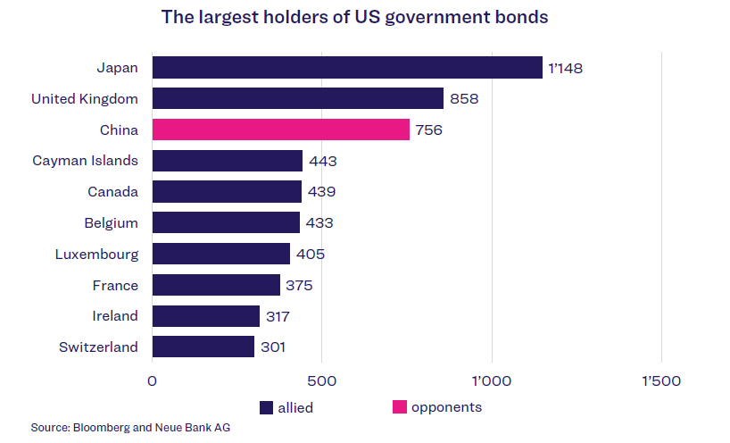 The US dollar is the world’s most important currency and thus another seismograph for confidence in the American economy. Currently, both the USD index and confidence in the United States as a reliable partner are in decline. Since taking office, Donald Trump has continuously weakened the US dollar with his erratic policies. The US dollar index, which compares the US currency with an international basket of currencies, has lost around ten per cent of its value since the beginning of the year. The balance sheet has never been worse since the turn of the millennium. Another risk for the USD comes from the holders of US government bonds. The United States’ allies hold the largest share of US Treasuries.