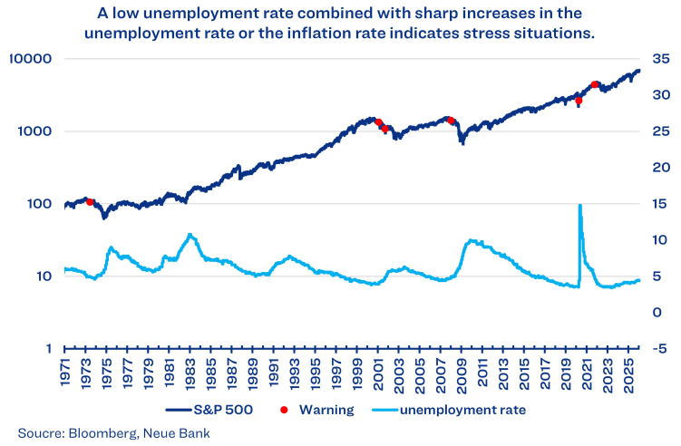 With a current unemployment rate of 4.4%, we are operating in a range in which the 12-month performance of the S&P 500 was historically negative in roughly one-third of cases. Accordingly, there is a certain risk of stock market corrections. At the same time, however, the probability of further price gains is about twice as high, making the overall risk–return profile still appear attractive. The key question, therefore, is whether additional factors emerge that could trigger heightened stress in financial markets. Our analyses show that, in particular, a sharp increase in the unemployment rate of 0.25% per month—equivalent to an annualized rise of 3 percentage points—or a significant increase in inflation to above 5% per annum can act as such triggers (see red warning signals in the chart). At present, neither of these conditions is met. From this perspective, at least, no immediate obstacles to further market advances are apparent.