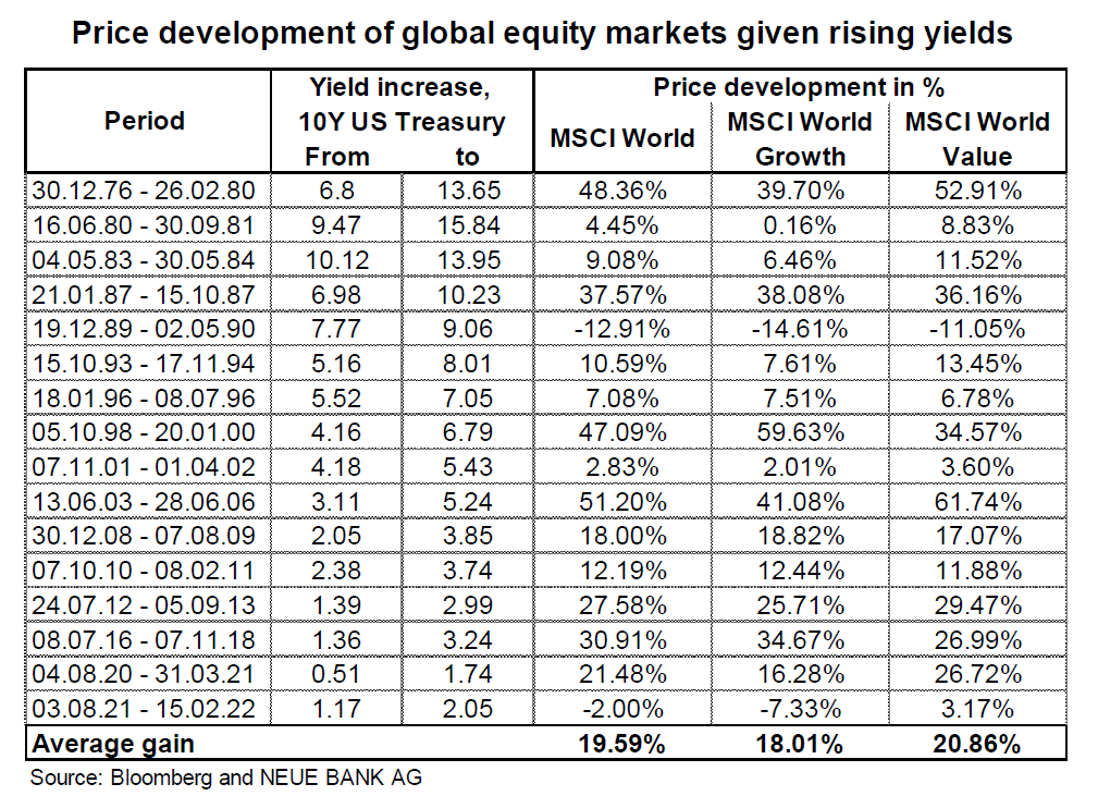 Most commentators appear to agree that rising interest rates weigh on the equity market. There is little historic evidence to that effect, however. On the contrary: historically, equity markets have usually risen when the US Federal Reserve (Fed) has raised interest rates, given that rate hikes are a clear sign of a strong economy. The following table and chart show the strongest increases in yields and the price development of the global equity market (MSCI World) over the past 46 years: