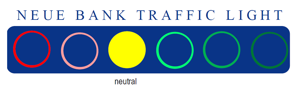 On average, the MSCI World Index gained 19.59% over all observed periods. Only at the beginning of the 90s and now is the world equity index in negative territory – but note that the current cycle of interest rate hikes is only just beginning. Typically, that is precisely when investors are most uncertain, leading to increased volatility on the markets. In the past, it was only once the central bank announced an approximate interest rate hike timetable that the equity markets calmed down. Major corrections have only ever occurred when the Fed has raised interest rates for too long, too sharply, and the economy slowed down too much as a result. But rising interest rates also have an impact on equity valuations. Highly valued companies in particular – i.e., growth stocks – are affected more strongly by this, given that future cash flows are discounted at a higher interest rate, resulting in declining enterprise value. This effect is also seen in the majority of historical observations. In such phases, growth stocks have on average performed less well than undervalued companies (value stocks) (see table). This is also currently the case, and some growth stocks have suffered significant setbacks. However, we believe that the large growth stocks offer long-term value, which is why the current weakness should not be overrated. We have not made any changes to the NEUE BANK traffic light, which is why it remains at yellow (neutral).