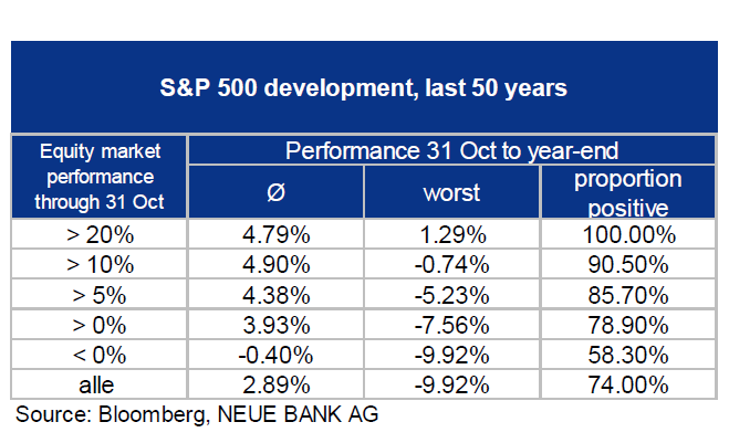 First of all: Statistically speaking, November and December are two of the most positive months on the equity markets. But our analysis shows that this may very well depend on performance through October. In years where the price gains through October already exceeded 20%, year-end performance was also positive without exception. Conversely, the lower the average performance, the higher was the proportion of negative price performance in the last two months of the year. If equity market performance was positive before the beginning of November, the rest of the year was also more successful than the average of all observations. In that light, the research indicates an optimal chance of a year-end rally. The worst precondition for rising share prices at the end of the year is when the first ten months were also a loss. But even then, the proportion of positive year-end performances exceeded 50%. So there would certainly have to be other reasons to completely do without equity investments during the last two months of a year. The NEUE BANK traffic light is light green, which signals a slight overweight in equities.