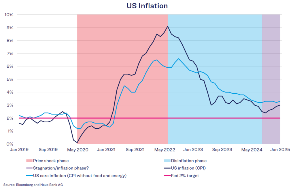 The US economy is currently in precisely this critical phase. The inflation trend is proving to be “sticky” – stubborn and persistent. In the second half of 2024, US economic output grew above its potential rate. Strong economic data, a robust labour market, and stable consumer spending suggest that growth of over 2% is also expected for the current quarter. This economic strength is the main reason for inflation’s continued persistence. Additional price pressure could arise from President Trump’s protectionist policies. His proposed tariffs and immigration restrictions could drive up supply-side costs, while pro-growth measures such as tax cuts and deregulation could further fuel demanddriven inflationary pressures. In an economy already operating at full capacity, such measures are likely to give inflation an additional boost. As a result, inflation remains a key factor that will continue to keep markets on edge this year.