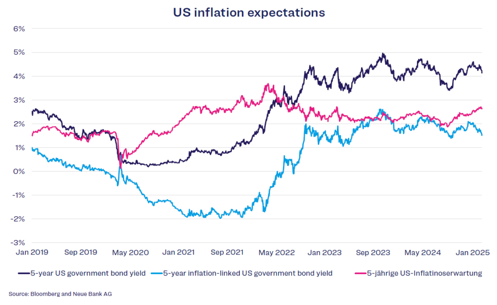 The rise in inflation risks is also reflected in 5-year US inflation expectations, which are calculated from the difference between the yield on 5-year US government bonds and the yield on 5-year inflation-linked US government bonds. Since September 2024, expectations have increased from below 2% to the current level of 2.6%.