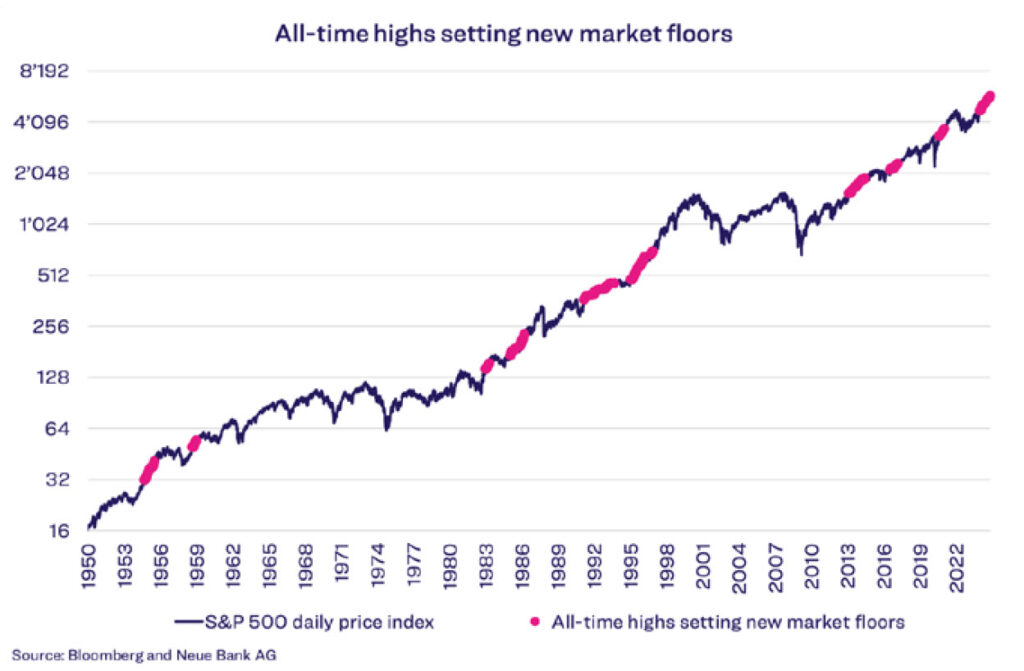 In light of the current highs on the equity markets, does it still make sense to invest, or is it better to wait for a possible major correction? Clients ask this question very often. No one can give an answer as to the best time to enter the market, since no one knows where prices will be in the future. Investors who set price targets for corrections may run the risk of missing the entry point completely if the price target is not reached. On the other hand, investors should not be scared away by equity markets that continue to rise. Historically, equity markets have risen over the long term, reaching new highs time and again. The following chart shows the long-term performance of the US equity market S&P 500 with market floors, which are defined as all-time highs from which the market never fell more than 5%.