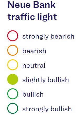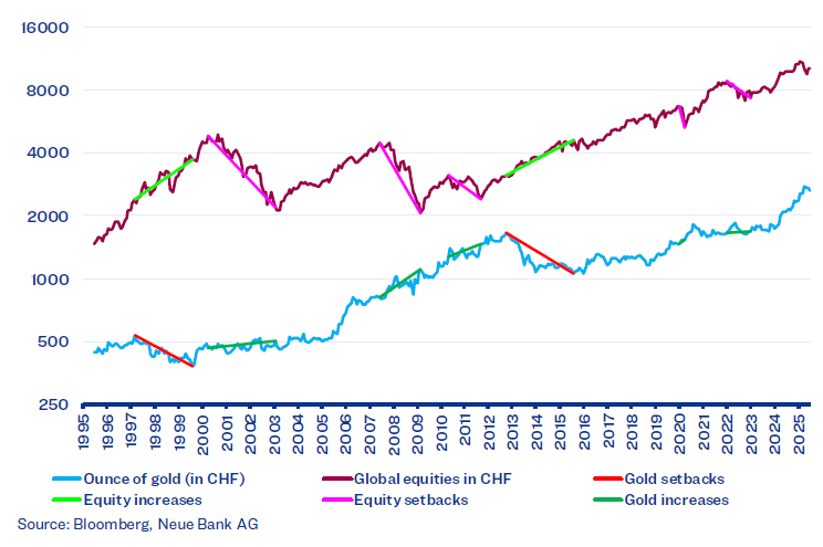 During equity market crises, gold often serves as a safe haven. In phases when gold consolidates, equities have regularly shown a positive trend over the past 30 years. This negative correlation has a favourable impact on portfolio risk, as it helps to reduce volatility. This has led us to include this asset class – even though it is more volatile when viewed in isolation – instead of less volatile bonds. Overall portfolio fluctuations should not increase significantly as a result.
