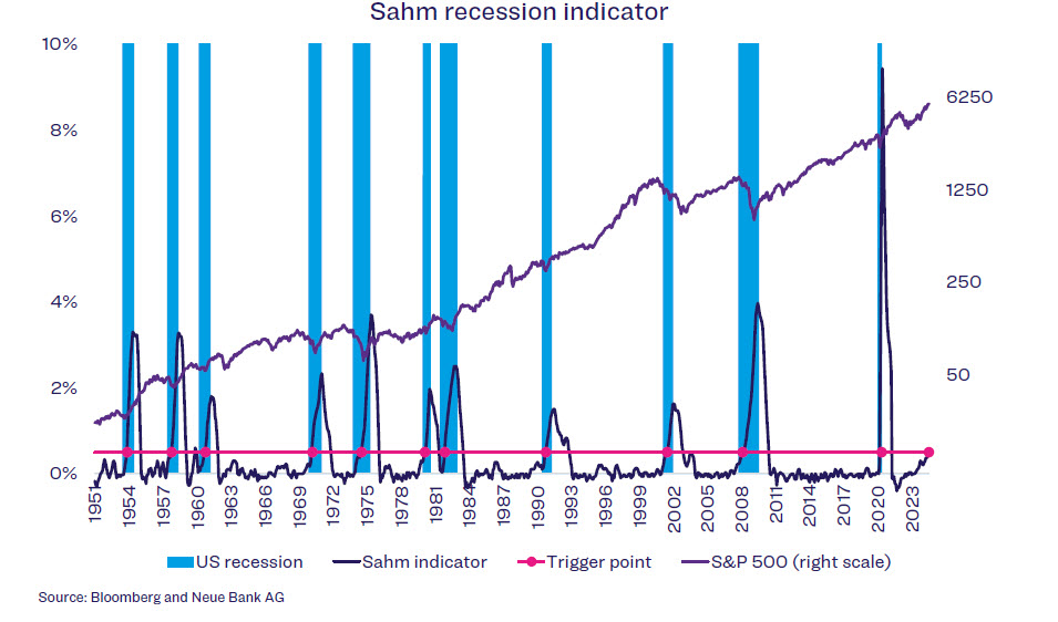 already be in a recession. The chart above illustrates how the Sahm indicator has historically signalled the trigger points after the start of a