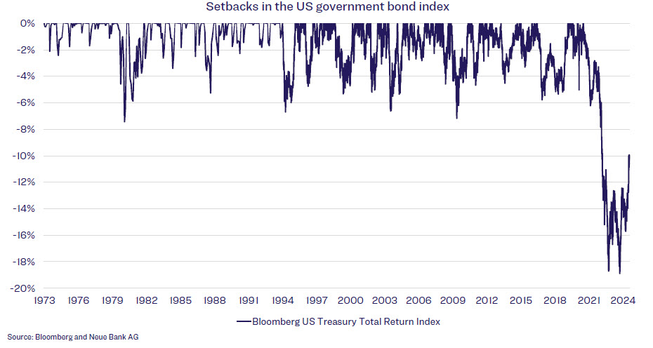 For instance, the US government bond index lost nearly 19% in value between August 2020 and October 2023. Such a setback is historically