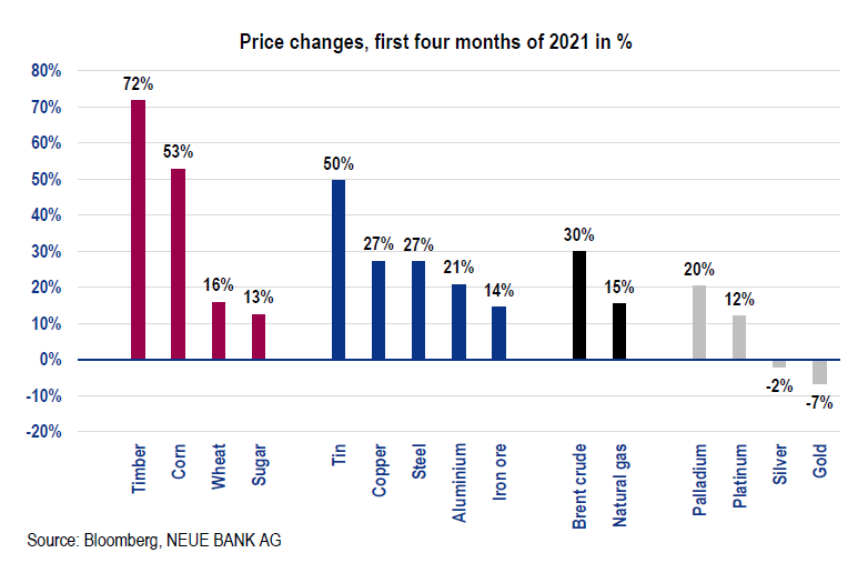 We’ve seen the strongest increase in timber. This is due to a construction boom in the US, where many employees began working from home. Those who expect to work from home for the longer term have taken the opportunity to move out of overpriced metropolises and can now afford their own home elsewhere. Single family homes in the US are primarily made of wood, which favoured the price rally. Sawmills had misjudged this development and reduced their production at the beginning of the pandemic. There is enough raw timber available, but it will take time before capacities are expanded as needed. We advise private investors not to speculate in individual commodities, including timber.