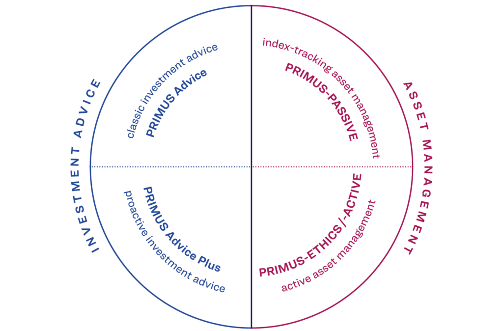 | PRIMUS Advice Classic investment advice with strategy monitoring for long-term investors. | PRIMUS Advice Plus Customised advisory model for professional investors with their finger on the pulse of the markets. | PRIMUS Asset Management Professional, tailored asset management solution to cover all needs. | |