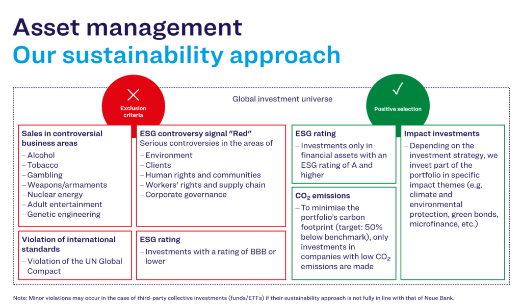 Depending on the investment strategy, we allocate part of the portfolio to specific impact themes, such as climate and environmental protection, green bonds, or microfinance. In mixed mandates, the selection process for the “bonds” and “alternative investments” asset classes is designed to be as similar as possible to that used for “equities.” However, due to differing methodologies, valuation approaches, and data availability, variations in the ESG quality of the selected investment instruments may occur.