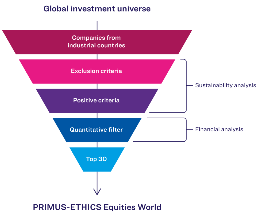 Sustainability-oriented investors are convinced that additional analyses of issuers based on ESG criteria lead to a more comprehensive understanding of opportunities and risks. They believe that companies that use raw materials and energy efficiently, treat their employees and suppliers fairly, or design their products to meet the growing environmental demands of their clients will also achieve greater economic success. By separating sustainability analysis and financial analysis, we ensure, firstly, the consideration of sustainability principles and, secondly, the application of our specially developed quantitative filter, which selects the 30 best stocks. This approach enables investment in companies with consistently positive share price development, aiming to outperform the benchmark index while simultaneously reducing the portfolio’s carbon footprint.