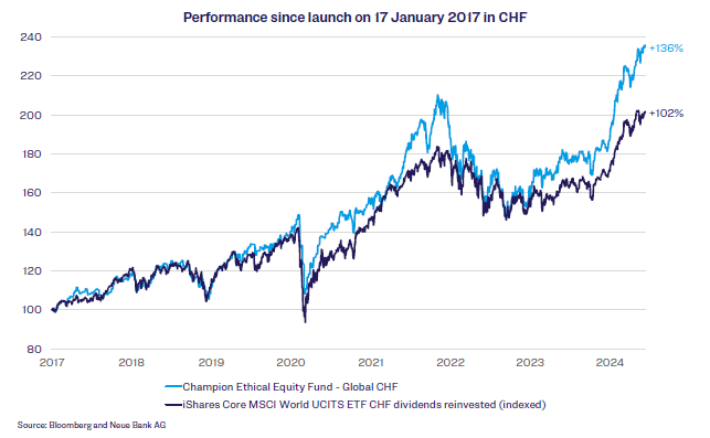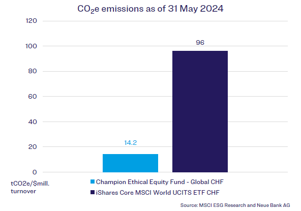 People living in the western world produce an average of about 10 metric tons of CO2 equivalents (CO2e is a unit of measurement used to standardise the various greenhouse gases) per person per year. To mitigate the impact of climate change, this average would have to be reduced to 2 metric tons of CO2e, i.e. by 80% per person, by 2030. But how can we reduce our carbon footprint without complete renunciation? The familiar measures include conscious consumption, solar power, sustainable heating systems, and electromobility. But there is also another way to make a big difference – with sustainable investments. Neue Bank is a pioneer in this area and has been offering sustainable investments for many years. Our primary goal is to reduce our carbon footprint. We only consider companies that report low CO2e emissions based on measurable data and are striving to further reduce those levels in future. The decisive factor for our approach is therefore not the company’s end product, but how sustainably and resource-efficiently the product is produced. We also exclude all companies that are active in controversial business areas such as alcohol, tobacco, gambling, weapons/armaments, nuclear energy, adult entertainment, genetic engineering, oil, gas, and coal. Additionally, the companies must be among the best in environmental, social, and governance (ESG) rankings, achieving an MSCI ESG rating of A or better. Finally, the remaining companies undergo our quantitative financial analysis, of which the best 30 companies are included in the portfolio. This strategy has been implemented in our asset management since 2009 and, since the beginning of 2017, in our Champion Ethical Equity Fund – Global, for which we serve as investment advisors. This approach has enabled us to significantly outperform the benchmark: