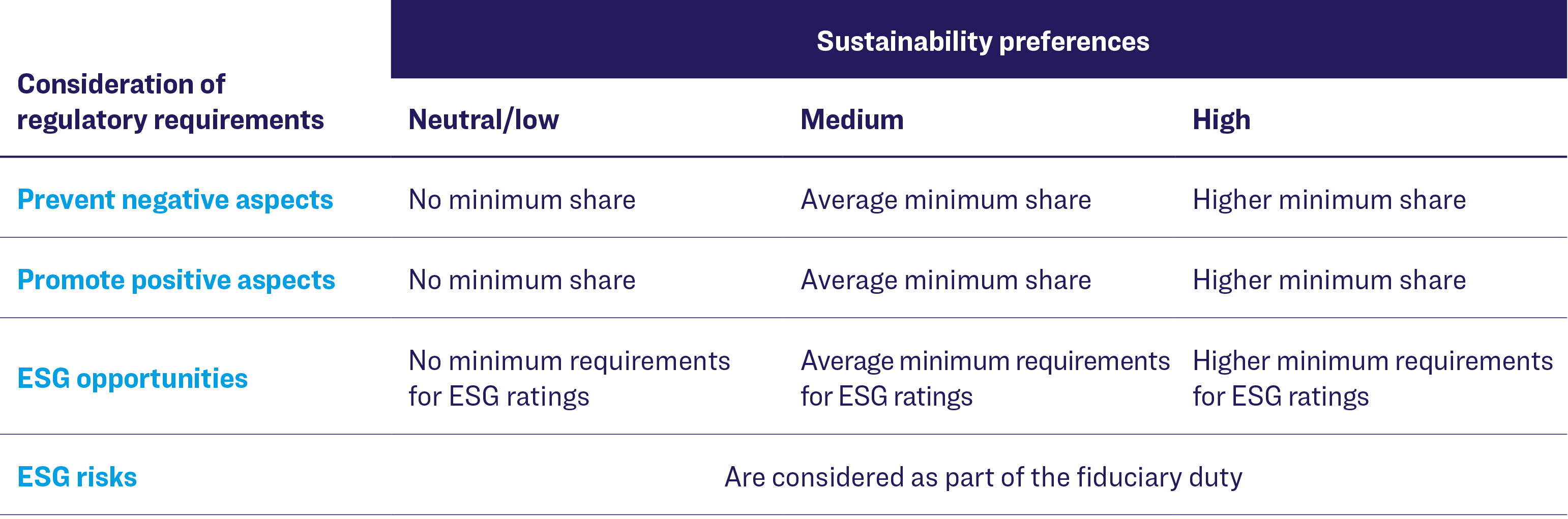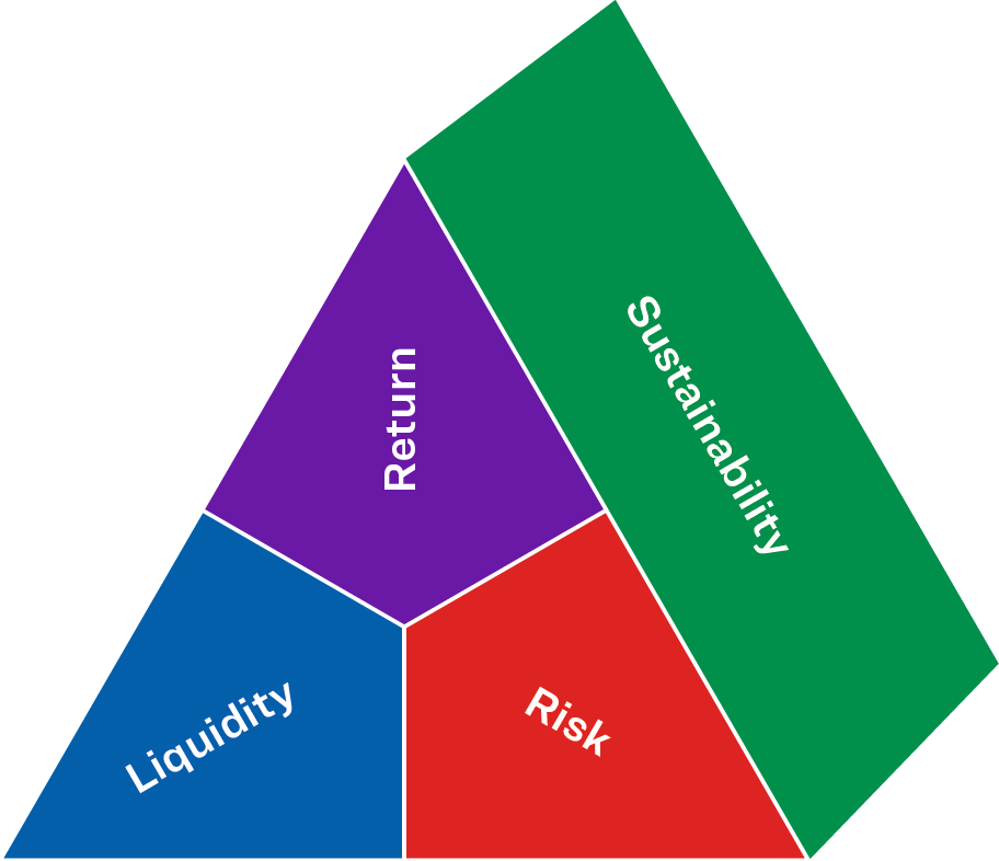 The classic investment triangle, consisting of liquidity, return, and risk, is now supplemented by a further dimension in the form of sustainability criteria. By expressing your sustainability preferences, you yourself determine the depth to which the third dimension of sustainability criteria should be incorporated into your individual investments.