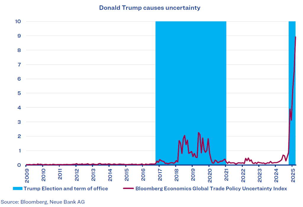 Last month, the New Bank traffic light switched to amber mentioned us to reduce risk. This decision is closely linked to the uncertainties described above. In the financial world, the term “wall of worry” is often used to describe the challenges markets face, and currently, there are many concerns weighing on the market. The Trump administration, which has only recently returned to power, is not only bringing the familiar issue of tariffs back onto the agenda but is also causing additional uncertainty with sudden and unpredictable geopolitical demands (incorporation of Greenland and Canada, takeover of the Panama Canal, resettlement of the Gaza Strip). In addition, Russia’s war of aggression in Ukraine remains unresolved. The relationship between the USA and its allies, as well as the future of NATO, is also increasingly under scrutiny.