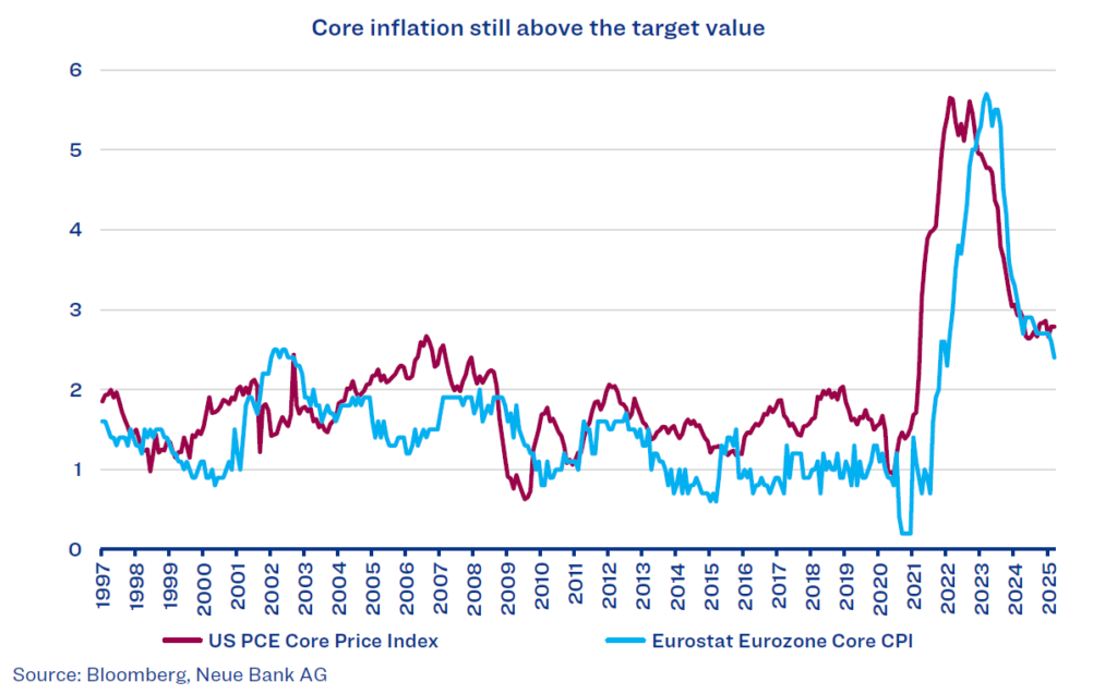 Although core inflation in both the USA and the eurozone remains just below 3% – which is well above the target of 2% per year – the markets are still anticipating two further interest rate cuts in the respective currency areas.