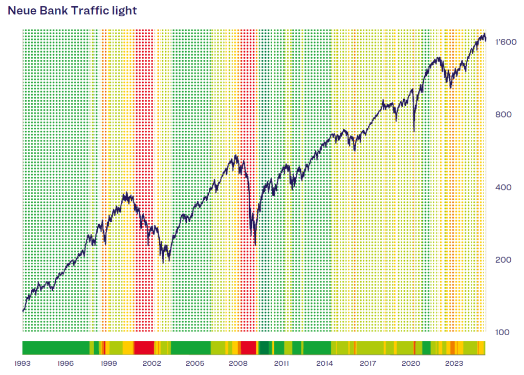 In times of fear and geopolitical tension, it is particularly important to manage your own investments carefully. The ‘wall of worry’ represents a constant challenge, but whether and how well this ‘wall’ can be overcome remains to be seen. This is where the Neue Bank Ampel comes to our aid as a reliable risk management tool, helping us stay oncourse in turbulent times without letting emotions drive decisions.
