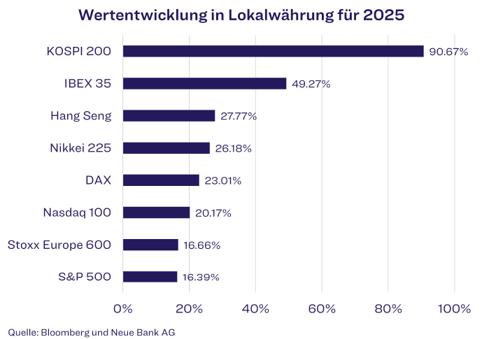2025 war ein gutes Jahr für Aktien, allerdings erneut geprägt von einer hohen Marktkonzentration. Die grossen Aktienindizes erreichten neue Allzeithochs, wurden jedoch von wenigen Schwergewichten beziehungsweise einzelnen Sektoren getragen. Insbesondere Titel aus den Bereichen Künstliche Intelligenz, Finanzen, Rüstung, Versorger und Rohstoffe fungierten als Haupttreiber. Klassische Industriewerte sowie Nebenwerte zählten hingegen zu den Verlierern beziehungsweise Underperformern. Unter den bekannten Indizes verzeichnete der südkoreanische KOSPI 200 die stärkste Performance. Getragen von der KI Euphorie legte der Index um über 90 % zu, wobei zwei Titel – Samsung Electronics und SK Hynix – mit einer gemeinsamen Gewichtung von über 45 % massgeblich zu dieser Entwicklung beitrugen. Auch Europa konnte überzeugen: Allen voran der spanische IBEX 35, welcher um knapp 50 % anstieg. Getragen wurde die positive Entwicklung vom stark gewichteten Finanzsektor, der sich für den Grossteil der Performance verantwortlich zeigt. Wie aus der nachfolgenden Grafik ersichtlich, zählt der US-Markt mit einem Plus von rund 16 % im internationalen Vergleich hingegen nur zu den Schlusslichtern.