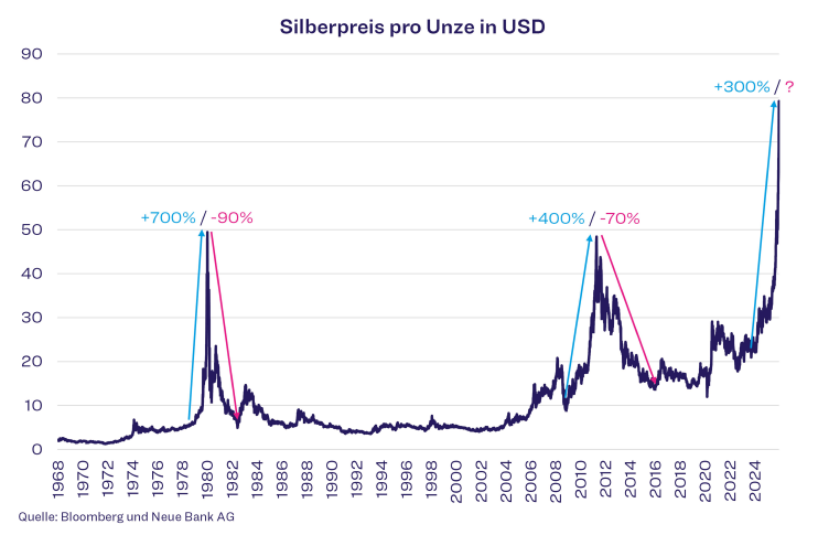 Der Silberpreis verzeichnete im Jahr 2025 eine historische Rallye und stieg zeitweise auf über USD 80 pro Unze, was einer Rendite von mehr als 175 % entspricht. Haupttreiber dieser Entwicklung war ein strukturelles Angebotsdefizit: Die industrielle Nachfrage – insbesondere aus den Bereichen Photovoltaik und Künstliche Intelligenz – übertraf das stagnierende Minenangebot bereits im fünften Jahr in Folge. Zusätzlich erhöhten die Zinssenkungen der US-Notenbank die Attraktivität des Edelmetalls für Anleger, während geopolitische Spannungen die Nachfrage nach Sachwerten weiter verstärkten. Für das Jahr 2026 ergeben sich daraus weiterhin Chancen, insbesondere falls die globale Energiewende an Dynamik gewinnt und das Angebot an Silber, aufgrund seiner zentralen Rolle in der Elektronikindustrie, knapp bleibt. Ein anhaltend schwacher US-Dollar könnte den Silberpreis zusätzlich unterstützen. Demgegenüber stehen jedoch erhebliche Risiken. Ein möglicher konjunktureller Abschwung könnte die industrielle Nachfrage abrupt bremsen. Zudem besteht nach dem aussergewöhnlich starken Anstieg im Jahr 2025 die Gefahr signifikanter Gewinnmitnahmen sowie einer deutlichen Preiskorrektur, insbesondere durch spekulative Marktteilnehmer. Historisch betrachtet kam es seit 1950 bereits zweimal zu vergleichbaren Phasen extremer Preisanstiege mit anschliessend starken Korrekturen.