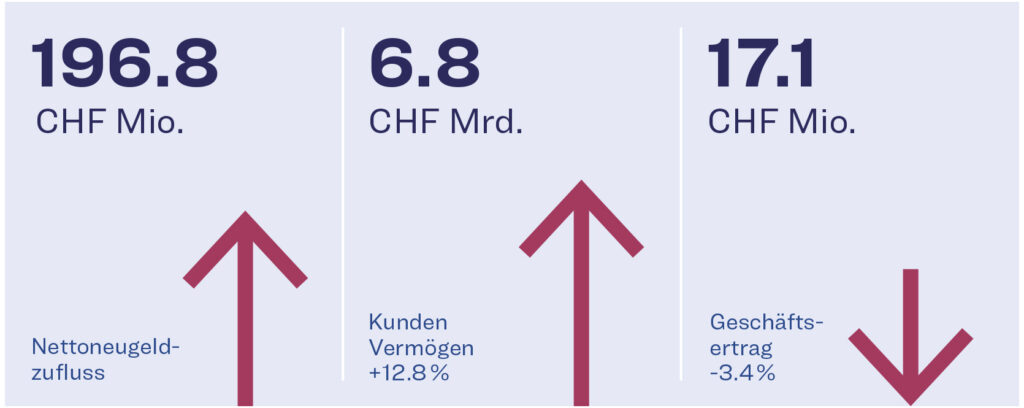 Der Nettoneugeldzufluss entwickelte sich im ersten Halbjahr 2024 positiv und belief sich auf beachtliche CHF 196.8 Mio. Gleichzeitig erhöhten sich die betreuten Kundenvermögen seit Ende 2023 um rund CHF 770 Mio. bzw. 12.8 Prozent auf CHF 6.8 Mrd. und damit auf einen neuen Höchststand.