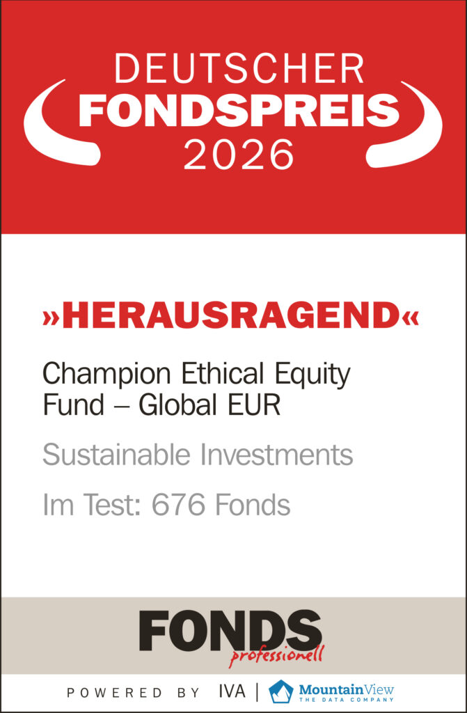 Der Champion Ethical Equity Fund – Global EUR wurde in der Kategorie «Sustainable Investments» mit der höchsten Auszeichnung «herausragend» beim Deutschen Fondspreis 2025 geehrt. Diese bedeutende Auszeichnung würdigt die aussergewöhnliche Leistung des Fonds und basiert auf einer umfassenden Analyse, die von einer Fachjury durchgeführt wurde.