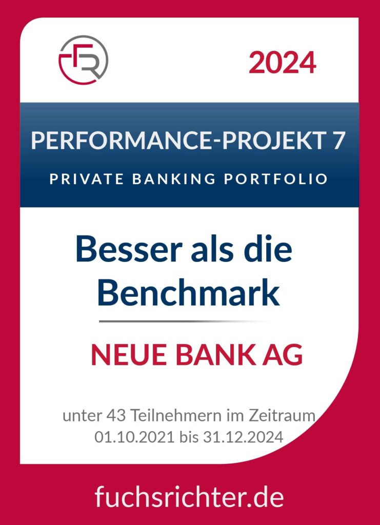 Auch im aktuellen Performance-Projekt 7 (Private Banking Portfolio) der unabhängigen Prüfinstanz FUCHS | RICHTER hat die Neue Bank herausragende Ergebnisse erhalten. Seit dem Start im Oktober 2021 haben wir nicht nur kontinuierlich die Benchmark übertroffen, sondern auch zahlreiche Mitbewerber hinter uns gelassen.