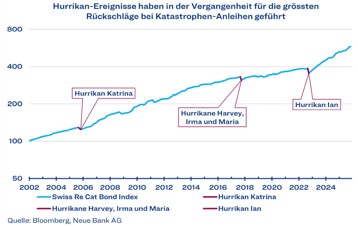 zum Frühsommer minimal ist. Neben der saisonalen Entspannung sprechen weitere strukturelle Faktoren für Cat-Bonds. Die Renditen sind grundsätzlich hoch, weil einzelne Anleihen im Katastrophenfall das Risiko eines Totalausfalls tragen. Dieses erhöhte Risiko wird durch attraktive Coupons abgegolten, die typischerweise eine deutliche Marge gegenüber traditionellen Investment-Grade-Unternehmens- oder Staatsanleihen aufweisen. Der entscheidende Vorteil für Investoren liegt jedoch in der Art des zugrunde liegenden Risikos. Dieses korreliert nicht mit den üblichen Treibern der Finanzmärkte – wie Konjunkturzyklen, Zinsentwicklungen oder geopolitischen Spannungen – sondern ist an spezifische Naturereignisse gekoppelt. Da beispielsweise Hurrikan- und Erdbebenrisiken statistisch unabhängig voneinander auftreten und keinerlei Verbindung zum Kapitalmarktgeschehen aufweisen, bieten Cat-Bonds eine exzellente Diversifikationsmöglichkeit. Diese geringe bis nicht vorhandene Korrelation ermöglicht es, Portfolios gezielt so zu strukturieren, dass eine robuste Risikostreuung erreicht wird. Dennoch haben vor allem Hurrikane in den letzten 20 Jahren vereinzelt zu Rückschlägen geführt, wobei der grösste im Jahr 2022 beim Hurrikan Ian mit einem Kursverlust von 9% (auf Monatsbasis in USD) zu verzeichnen war: