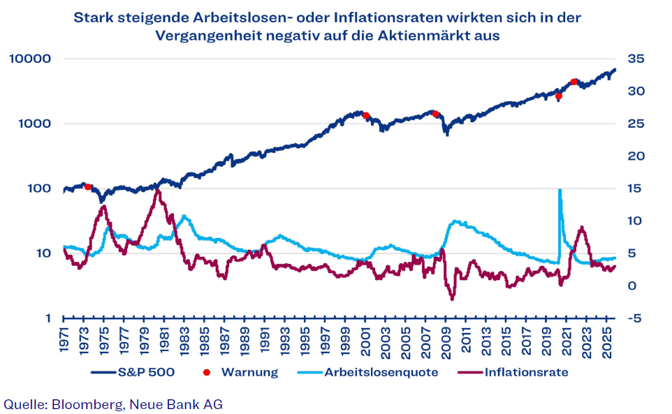 In der Vergangenheit galt: Solange die Arbeitslosigkeit unter 5 % lag und entweder die Inflationsrate (über 5 % pro Jahr) oder die Arbeitslosenquote (mehr als 0,25 % im Monat) stark anzog, kam es oft zu signifikanten Rücksetzern an den Aktienmärkten (siehe Rot eingezeichnete Warnsignale). Derzeit steigen die Arbeitslosenzahlen zwar, jedoch in einem sehr moderaten Tempo. Auch die Teuerung liegt oberhalb des 2% Ziels der Federal Reserve, bleibt aber klar unter der kritischen 5% Schwelle. Dieses scheinbar stabile Umfeld bietet grundsätzlich ein solides Fundament für das kommende Anlagejahr. Die entscheidende Frage lautet jedoch: Bleibt das so? Eine potenzielle Störquelle könnte die anstehende geldpolitische Lockerung darstellen. Der Markt preist derzeit optimistisch rund drei bis vier Zinssenkungen bis Ende kommenden Jahres ein.