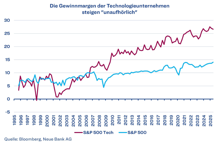 Eine genaue Betrachtung der Margenentwicklung untermauert die Outperformance der Technologiebranche. Während der breite Markt lediglich eine moderate Margenausweitung verzeichnete – die massgeblich durch den Tech-Sektor selbst getrieben wurde – konnten Technologieunternehmen ihre Profitabilitätskennzahlen sukzessive und signifikant steigern. Diese Divergenz wirft die entscheidende strategische Frage nach der Nachhaltigkeit dieser Entwicklung auf: Inwieweit ist eine weitere Steigerung der operativen Effizienz und Profitabilität realisierbar? Die gängige Marktthese besagt, dass, solange die Margenexpansion anhält, auch Premium-Bewertungen – sprich, höhere Multiples – fundamental gerechtfertigt erscheinen. Vor diesem Hintergrund bleibt unser Haus bei der taktischen Positionierung: Wir halten an einer leichten Übergewichtung von Aktien fest.