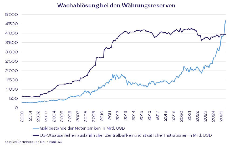Von einem Gold-Crash war in den letzten Tagen vermehrt zu lesen. Einen Crash sehen wir jedoch nicht, sondern eine normale Korrektur in einem intakten Aufwärtstrend. Den Höchststand erreichte das Gold am 20. Oktober mit einem Preis von USD 4’356 pro Unze, was einem Plus von 65 Prozent seit Anfang Jahr entsprach. Der letzte Anstieg, der Ende August begann, verlief sehr steil und schnell. Solche extremen Bewegungen haben meistens eine Korrekturphase zu Folge. Die Gold-Rallye hat uns dazu veranlasst, Gewinne zu realisieren und unsere Goldposition auf die strategische Quote zu reduzieren. Gold bleibt in Anbetracht der weltweiten Unsicherheiten weiterhin gefragt. Ein wichtiger Faktor ist der schwache US-Dollar aber auch die aussergewöhnlichen Zeiten mit geopolitischen Konflikten und einer deutlichen Zunahme der globalen Staatsverschuldung. In diesem Umfeld glänzt das gelbe Edelmetall mit seiner Funktion als sicherer Hafen als Absicherung vor Währungsrisiken und Inflation. Der Wert der Goldbestände der globalen Notenbanken übersteigt mittlerweile die Summe der US-Staatsanleihenbestände, die von Notenbanken und staatlichen Institutionen im Ausland gehalten werden.
